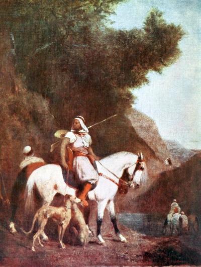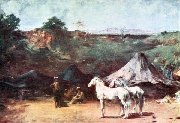 Eugène Fromentin will be remembered as the painter of Algeria, or at least as one of the first who revealed it in such a way as to make it beloved. Not the Algeria of the South, lost amid a furnace of sunshine and of sand, but the Algeria which is accessible to all, that of the Arabs, with peaceful cities set in the midst of ruins, and grateful palm groves forgotten, like baskets after a festival, on the border of the desert; the Algeria of ceremonious and brilliant fantasias, of mosques, of battle-fields still smoking, and of vagabond tribes. It may be regretted that he contented himself with seeing the Arab exclusively outside his tent, in the open light of sand and sky, and that, instead of confining his studies to external phases of life, he never ventured to penetrate to his hearthstone, in the intimacy of his family life. Yet who would reproach the artist for his scrupulous delicacy and discretion?