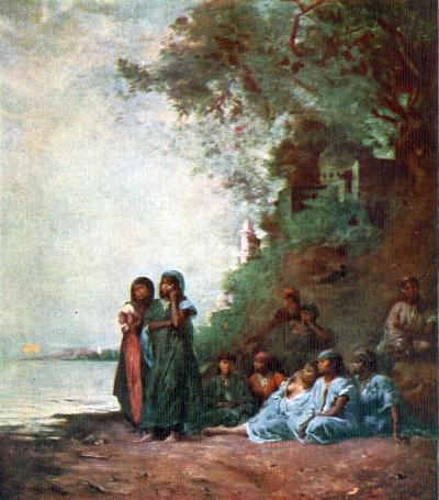In this attractive, verdant nook, lighted by a luminous patch of brilliant fabrics, the artist has harmoniously placed a group of women. While some of them, stretched at length beneath the shade, gossip together while they rest, two of their number are standing, and watch the flow of the sacred river, the mysterious Nile, witness of so many things, contemporaneous with so many illustrious civilizations. This picture is a masterpiece of composition and colour.