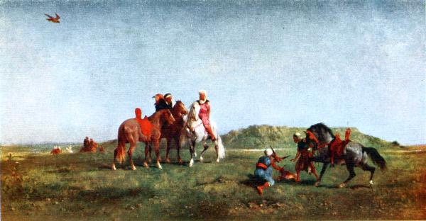 Falconry is an episode of African life which peculiarly attracted Fromentin. He has treated it in a number of different pictures, all equally remarkable. The collection in the Louvre possesses two: the one which we give here is distinguished by the cleverness of its composition, the way in which its component parts are distributed throughout the prospective, in accordance with the desired effect, thus lighting up the gray immensity with joyous and violent tints.