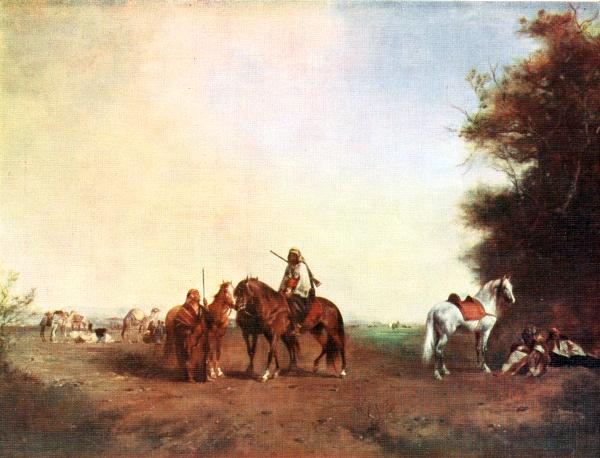 Suddenly, in 1861, Fromentin’s manner was marked by a complete evolution. Not that he abandoned the fine and delicate methods habitual with him, the methods of a poet seeking to interpret his visions and his sentiments through his skill in animated composition. Nothing of his originality was sacrificed. His power, on the contrary, was increased, because he had learned, in regard to the inspiration of his works, how to see reality more truly, and in regard to the resources of his art, how to understand better the superior methods of his compeers and his masters. But he had seen Corot, and his admiration of him increased day by day; it was the influence of the painter of The Farm Wagon that induced him to render the value of colour tones in accordance with their harmonies rather than their contrasts.