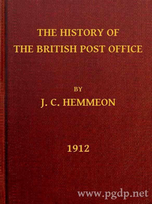The Project Gutenberg EBook of The History of the British Post Office, by Joseph Clarence Hemmeon This eBook is for the use of anyone anywhere at no cost and with almost no restrictions whatsoever. You may copy it, give it away or re-use it under the terms of the Project Gutenberg License included with this eBook or online at www.gutenberg.org Title: The History of the British Post Office Author: Joseph Clarence Hemmeon Release Date: June 18, 2013 [EBook #42983] Language: English Character set encoding: ISO-8859-1 *** START OF THIS PROJECT GUTENBERG EBOOK HISTORY OF THE BRITISH POST OFFICE *** Produced by Adrian Mastronardi, Eric Skeet, The Philatelic Digital Library Project at http://www.tpdlp.net and the Online Distributed Proofreading Team at http://www.pgdp.net (This file was produced from images generously made available by The Internet Archive/Canadian Libraries)