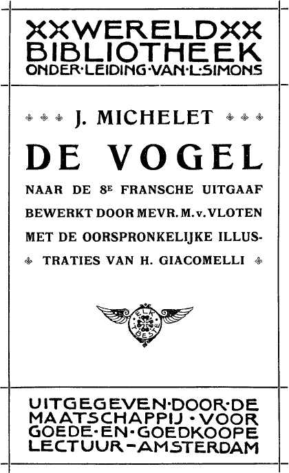 The Project Gutenberg EBook of De vogel, by Jules Michelet This eBook is for the use of anyone anywhere at no cost and with almost no restrictions whatsoever. You may copy it, give it away or re-use it under the terms of the Project Gutenberg License included with this eBook or online at www.gutenberg.org Title: De vogel Author: Jules Michelet Illustrator: Hector Giacomelli Translator: Martha van Vloten Release Date: July 6, 2013 [EBook #43105] Language: Dutch Character set encoding: ISO-8859-1 *** START OF THIS PROJECT GUTENBERG EBOOK DE VOGEL *** Produced by The Online Distributed Proofreading Team at http://www.pgdp.net
