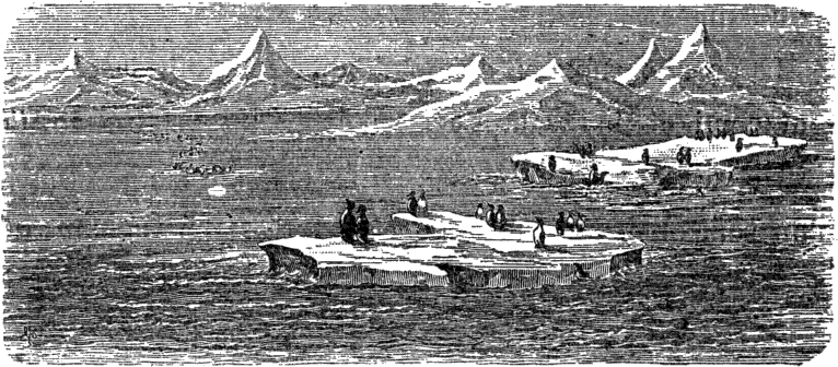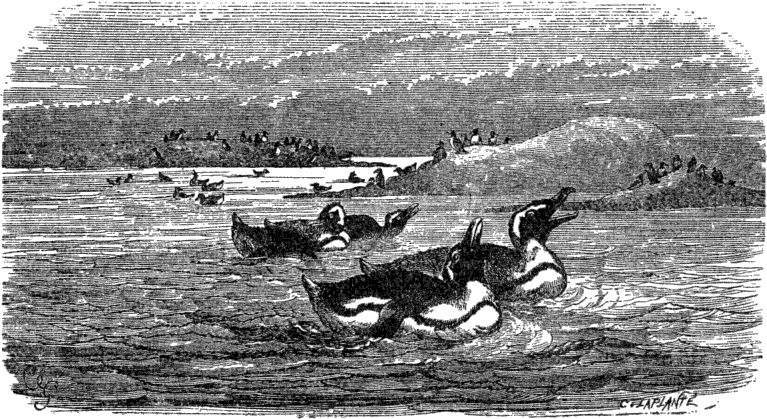 En toen het zeevolk er landde, was er maar één moeielijkheid: hoe door die dichte drommen dier goedige robben te dringen, die hen nieuwsgierig aankeken. De pingouïns van de Zuidpool, de vetganzen van het Noorden, van een vreedzame bedaardheid en bovendien zeer slecht ter been, verroerden zich niet. De ganzen, wier zeldzaam fijne en zachte donsveeren het eiderdons leveren, lieten zich rustig naderen en met de hand aanraken.