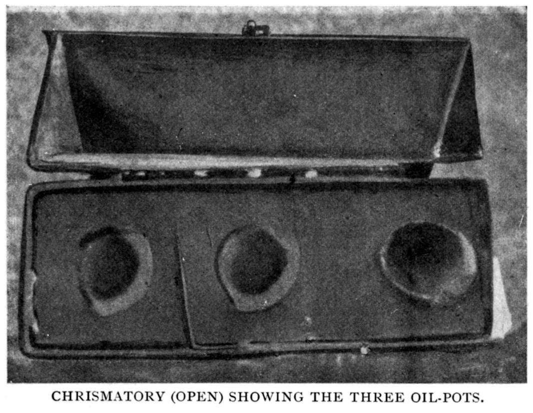 At a meeting of the Society of Antiquaries on December 16th, 1880, it was thus described:—"It is a brass box 6 inches long, 2 inches broad, and 2 inches high. The lid is high-pitched, with slanting gable-ends nearly equilateral, and surmounted by a vertical crest or ridge pierced with quatrefoils. The extreme height of the lid is 2-⅜ inches; that of the vertical crest is ⅞ inch. The lid is attached behind by two hinges, each ½ inch broad, and of which the raised plates are riveted to the back and lid of the box. The lid is fastened, not locked, by a hasp attached by a plate, and dropping on to a moveable catch on the face of the box. The upper and lower edges of the box, and its ridge, are mounted with mouldings attached by rivets. On opening the lid we found three oil-pots, all of them in fragments, and to none of them are the lids still remaining. At the bottom of the pots, however, are traces of some fibrous material. The pots, unlike the box itself, are of pewter." The necessity of keeping the three oils—(1) the holy chrism, (2) the oil for the sick, (3) the oil for catechumens—in distinct compartments is insisted upon by Archbishop Ælfric: "Ye ought to have three flasks ready for the three oils, for we dare not put them together in one oil vessel, because each of them is hallowed apart for a particular service."