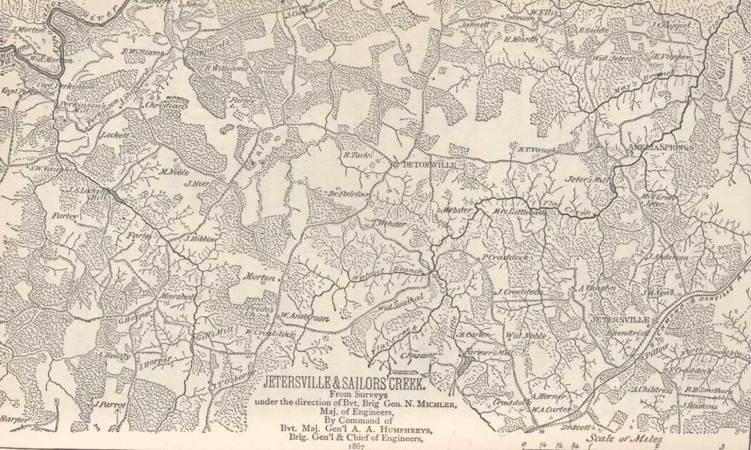 On the morning of the 6th, it was found that General Lee was moving west of Jetersville, towards Danville. General Sheridan moved with his cavalry (the 5th corps having been returned to General Meade on his reaching Jetersville) to strike his flank, followed by the 6th corps, while the 2d and 5th corps pressed hard after, forcing him to abandon several hundred wagons and several pieces of artillery. General Ord advanced from Burkesville towards Farmville, sending two regiments of infantry and a squadron of cavalry, under Brevet Brigadier-General Theodore Read, to reach and destroy the bridges. This advance met the head of Lee's column near Farmville, which it heroically attacked and detained until General Read was killed and his small force overpowered. This caused a delay in the enemy's movements, and enabled General Ord to get well up with the remainder of his force, on meeting which, the enemy immediately intrenched himself. In the afternoon, General Sheridan struck the enemy south of Sailors' Creek, captured sixteen pieces of artillery and about four hundred wagons, and detained him until the 6th corps got up, when a general attack of infantry and cavalry was made, which resulted in the capture of six or seven thousand prisoners, among whom were many general officers. The movements of the 2d corps and General Ord's command contributed greatly to the day's success.