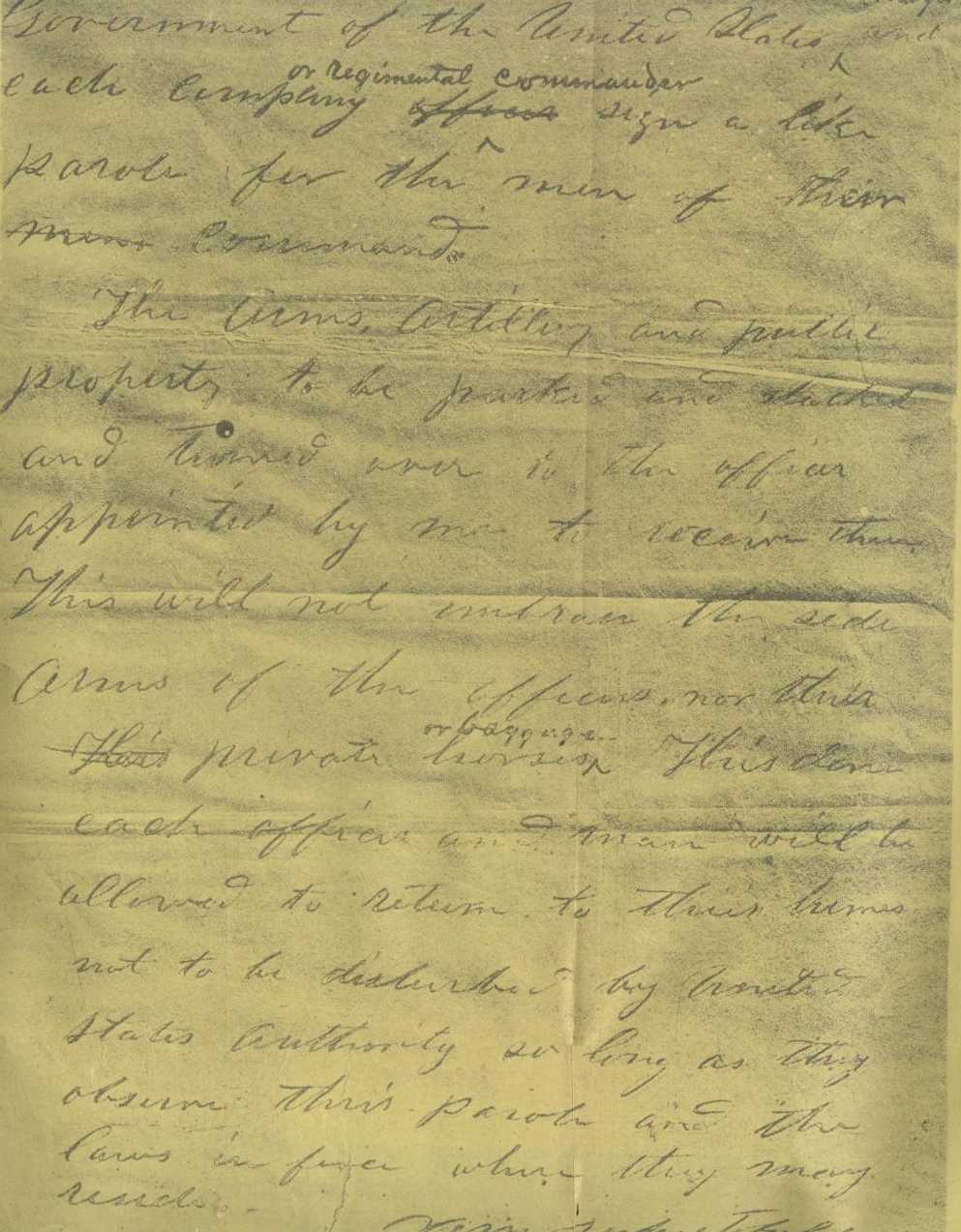 "GENERAL: In accordance with the substance of my letter to you of the 8th instant, I propose to receive the surrender of the Army of Northern Virginia on the following terms, to wit: Rolls of all the officers and men to be made in duplicate, one copy to be given to an officer to be designated by me, the other to be retained by such officer or officers as you may designate. The officers to give their individual paroles not to take up arms against the Government of the United States until properly exchanged; and each company or regimental commander sign a like parole for the men of their commands. The arms, artillery, and public property to be parked and stacked, and turned over to the officers appointed by me to receive them. This will not embrace the side-arms of the officers, nor their private horses or baggage. This done, each officer and man will be allowed to return to his home, not to be disturbed by United States authority so long as they observe their paroles and the laws in force where they may reside.