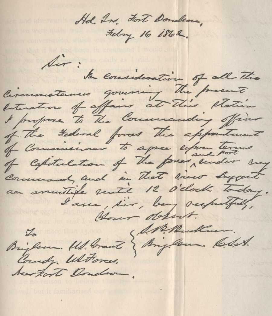 "GENERAL:—I received your note of this morning on the picket-line, whither I had come to meet you, and ascertain definitely what terms were embraced in your proposal of yesterday with reference to the surrender of this army. I now ask an interview, in accordance with the offer contained in your letter of yesterday, for that purpose.