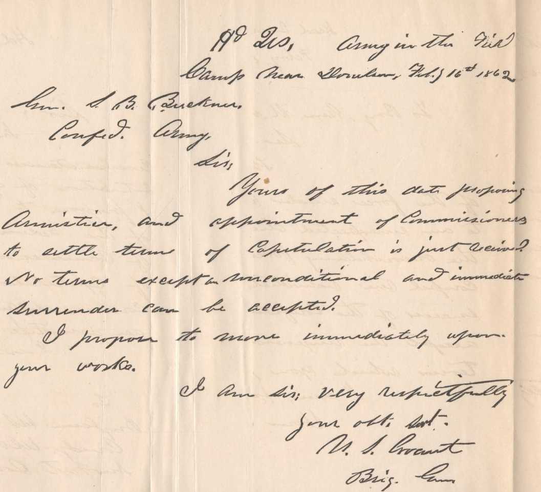 "GENERAL:—Your note of last evening, in reply to mine of same date, asking the condition on which I will accept the surrender of the Army of Northern Virginia, is just received. In reply, I would say, that peace being my great desire, there is but one condition I would insist upon—namely, That the men and officers surrendered shall be disqualified for taking up arms again against the Government of the United States until properly exchanged. I will meet you, or will designate officers to meet any officers you may name for the same purpose, at any point agreeable to you, for the purpose of arranging definitely the terms upon which the surrender of the Army of the Northern Virginia will be received.