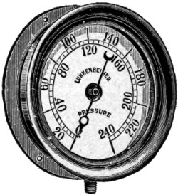 The steam gauge is a delicate instrument arranged so as to indicate by a pointer the pounds of pressure which the steam is exerting within the boiler. It is extremely important, and a defect in it may cause much damage.