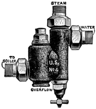 In addition to the glass water gauge, there are the try-cocks for ascertaining the level of the water in the boiler. There should be two to four of these. They open directly out of the boiler sheet, and by opening them in turn it is possible to tell approximately where the water stands. There should be one cock near the level of the crown sheet, or slightly above it, another about the level of the lower gauge cock, another about the middle of the gauge, another about the level of the upper gauge, and still another, perhaps, a little higher. But one above and one below the water line will be sufficient. If water stands above the level of the cock, it will blow off white mist when opened; if the cock opens from steam-space, it will blow off blue steam when opened.