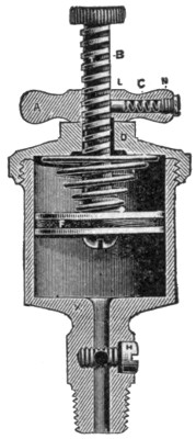 The cut shows the Kunkle safety valve. To set it, unscrew the jam nut and apply the key to the pressure screw. For more pressure, screw down; for less, unscrew. After having the desired pressure, screw the jam nut down tight on the pressure screw. To regulate the opening and closing of the valve, take the pointed end of a file and apply it to the teeth of the regulator. If valve closes with too much boiler pressure, move the regulator to the left. If with too little, move the regulator to the right.
