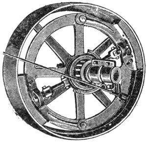 The side gear is used with a crank disc instead of arm. The reverse is the Grime, a single eccentric with device for shifting for reverse. The friction clutch has unusually long shoes, working inside the flywheel, with ample clearance when lever is off. A specialty is made of extra wide traction wheels for soft country. The traction gear is of the spur variety. There is also a double speed device offered as an extra.
