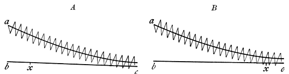 Let a represent the temperature at the commencement of earth-history and b that necessary for glaciation, and bc the lapse of time between then and now. The curved line indicates the gradual fall in temperature due to diminution of the amount of heat, while the zigzag line represents the oscillations due to secular [291] climatic changes. If the Cambrian period x occurred comparatively soon after the commencement of earth-history as shown in fig. A, no glaciation could be produced, even during periods when secular changes caused colder conditions than the mean, whereas if the Cambrian period occurred at a time very remote from the commencement of earth-history as shown in B, glacial conditions could be produced then as now, for the mean temperature, as shown by the distance of the curve from the line bc, would be practically as it now is. The studies of the last few decades have brought into prominence the occurrence of glacial periods in remote times, probably in early Palæozoic times; and as far as the mean temperature of the earth's surface is concerned, it would appear, from the knowledge in our possession, that matters were not very different in those early times from what they now are.