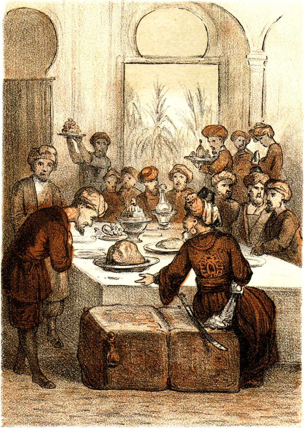 De lakkei bragt hem in eene groote zaal, waar een aanzienlijk gezelschap aan tafel zat. Op die tafel stond eene keur der heerlijkste spijzen te dampen. Aan het boveneinde zat een nog krachtvol grijsaard van een ernstig en, door zijn' langen witten baard, achtbaar voorkomen. Achter zijn' prachtigen zetel stonden eene menigte bedienden, die allen zich beijverden om op zijne wenken te letten. Deze zoo gevierde persoon was Sindbad.