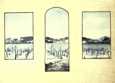 To our right Tivoli was hidden in mist, but Rocca del Papa and the Alban Mount rose like shadows to the south. The aqueducts marched across the plain, or stumbled into ruin among the flowers with which the merciful earth covered their fall. Lonely farms, towers, nameless tombs, grew out of the folds of the plain. And the early setting October sun, dipping into a haze, empurpled the fields and wove a golden halo round the sheep who bleated homewards in the melancholy of the dying sky. The little trees, like mourners, bent down towards the tombs, or seemed to shrink back to the earth. Only the stone pines with their heads to heaven were unconscious of the death around their roots.
