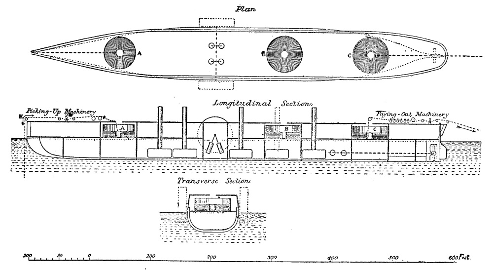 [59] The increased breaking strain here afforded over that of the first Atlantic line was partly due to the great improvement made in the manufacture of iron wire during the interval.