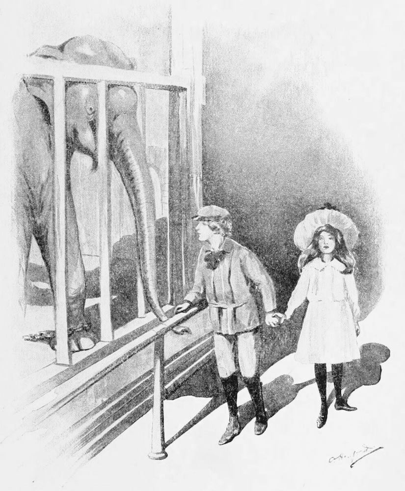 Presently, from a little distance up the Park walk leading to the door of the Elephant House, came a familiar tinkling sound that caused Mahmoud to turn his head in that direction with a show of interest. A boy was approaching, and at every step some [Pg 3]straps of iron on his little crooked leg clanked together. The sound was not unlike that made by the iron on Mahmoud's leg. The boy's face was pale, but his eyes were blue and very bright. A little girl skipped along at his side. The boy's clothes were shabby, but the little girl's plumage was rich and as gay as that of some tropical bird. Perhaps it was this that caused the boy to call her "Princess," when he made slow and deferential response to her eager chatter. It was plain that she was accustomed to rule, for whenever she was admonished by the young woman in dark clothes who followed a few steps behind with a book under her arm, she would merely shrug her pretty shoulders. Her manner toward the boy was a trifle condescending, but it was also affectionate, for she called him "Toots."