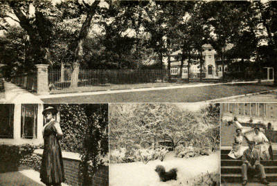 There are about forty other large trees in the yard besides, on either side of the bridge, a dense thicket of thorn and crab apple trees. Here the wrens and robins raise their broods in harmony with the saucy sparrows who live with us all the year, eat that which would be thrown away, and never disturb other birds' nests. They all bathe in the same pool and actually seem to appreciate our little dog Joe, who assumes great responsibility in keeping the cats from catching the young birds and the boys from climbing over our high iron fence.