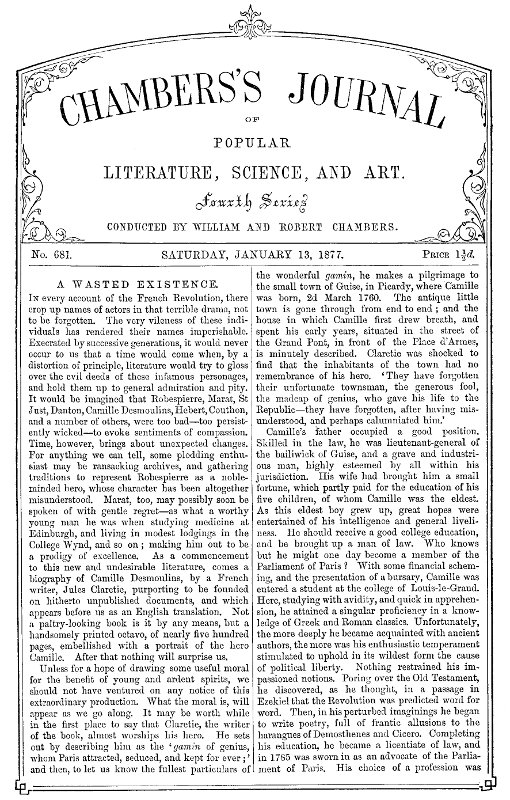 In every account of the French Revolution, there crop up names of actors in that terrible drama, not to be forgotten. The very vileness of these individuals has rendered their names imperishable. Execrated by successive generations, it would never occur to us that a time would come when, by a distortion of principle, literature would try to gloss over the evil deeds of these infamous personages, and hold them up to general admiration and pity. It would be imagined that Robespierre, Marat, St Just, Danton, Camille Desmoulins, Hebert, Couthon, and a number of others, were too bad—too persistently wicked—to evoke sentiments of compassion. Time, however, brings about unexpected changes. For anything we can tell, some plodding enthusiast may be ransacking archives, and gathering traditions to represent Robespierre as a noble-minded hero, whose character has been altogether misunderstood. Marat, too, may possibly soon be spoken of with gentle regret—as what a worthy young man he was when studying medicine at Edinburgh, and living in modest lodgings in the College Wynd, and so on; making him out to be a prodigy of excellence. As a commencement to this new and undesirable literature, comes a biography of Camille Desmoulins, by a French writer, Jules Claretie, purporting to be founded on hitherto unpublished documents, and which appears before us as an English translation. Not a paltry-looking book is it by any means, but a handsomely printed octavo, of nearly five hundred pages, embellished with a portrait of the hero Camille. After that nothing will surprise us.