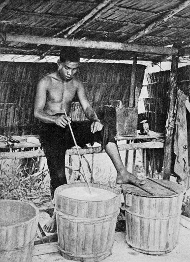 By about eleven o’clock most of the trees are ceasing for this day to yield milk. The coolies now make their rounds again for the purpose of collecting the day’s supply. The contents of the little cups are poured into pails and cans, which, as they are filled, are taken to the factory. Some of the carriers balance their load on their head, others hang a vessel at either end of a pole, scale-fashion, and balance the burden on one shoulder.