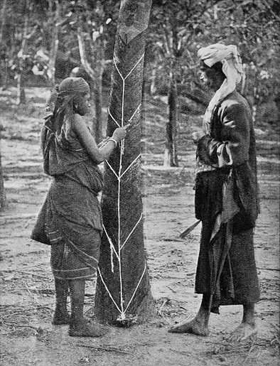 TAMIL WOMAN TAPPING RUBBER-TREE UNDER SUPERVISION OF A KANGANY, ON A CEYLON ESTATE. Page 80