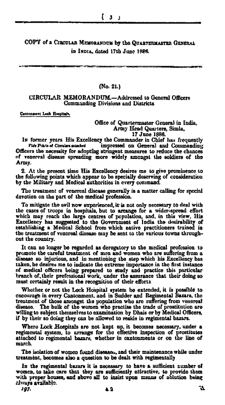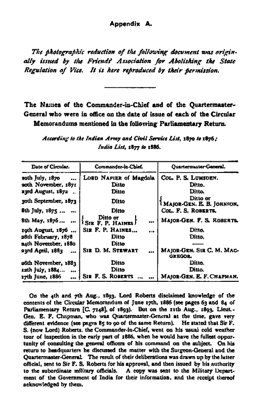 On June 17, 1886, a military order, known among the opponents of State regulation as the “Infamous Circular Memorandum,” was sent to all the Cantonments of India by Quartermaster-General Chapman, in the name of the Commander-in-Chief of the army in India (Lord Roberts). But during the course of the enquiry of the Departmental Committee of 1893, its real author was discovered to be Lord Roberts himself, not his Quartermaster-General.