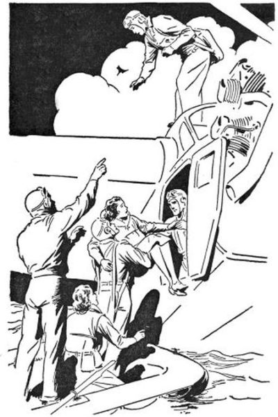 A rubber boat appeared under the plane wings, and two men paddled it easily toward them. When Hilda fell twice in trying to get over the gunwale one of the fliers stepped aboard and took her wasted form into his arms. Though Nancy and Mabel were both weak and trembling with excitement they managed to get into the rubber boat with the help of the second man. The other man went back for their coats and bags and soon they were under the shadow of the great wings. Eager hands lifted them bodily into the cabin.