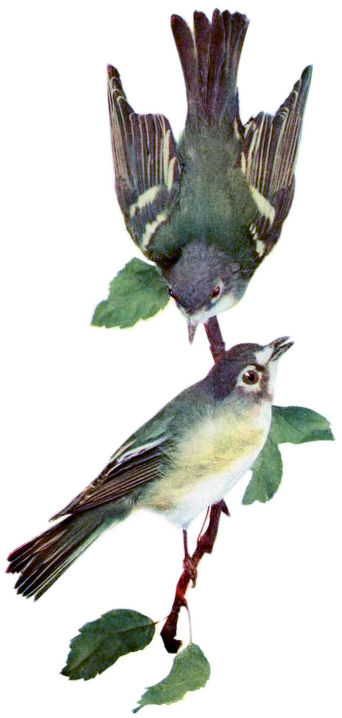 The Blue-headed Vireo, or its varieties, of which there are several, frequent nearly the whole of North America. The typical form of the species, that of our illustration, has a range covering Eastern North America and extending westward to the great plains. It breeds from Southern New England and the lake states northward to Hudson Bay and southward in the higher altitudes of the Alleghenies. It passes the winter in Cuba, Mexico and Central America. The Blue-headed Vireo is frequently called the Solitary Vireo, or Greenlet, because of its retiring habits. It is a bird of the forest and stays very close in these quiet retreats. Yet it is, as a rule, easy of approach, seeming to possess both curiosity and confidence. Mr. Bradford Torrey writes with enthusiasm regarding the pretty habits of this bird. He says: “Its most winning trait is its tameness. Wood bird as it is, it will sometimes permit the greatest familiarities. Two birds I have seen which allowed themselves to be stroked in the freest manner while sitting on the eggs, and which ate from my hand as readily as any pet canary; but I have seen others that complained loudly whenever I approached their tree. Perhaps they had had sad experiences.”