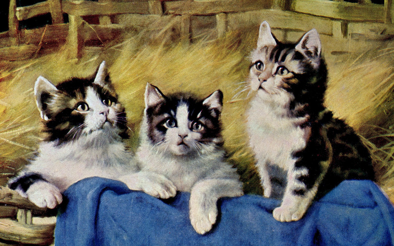 Large families are the custom with Cats, for usually five or six kittens are born at one time. As these cunning little objects are totally blind for nine days after birth, the devoted mother Cat must work industriously to properly care for them and especially to preserve them from danger. They must be hidden away from harm, as the father Cat would be perfectly willing to devour them, and would attack them as readily as he would a rat or a mouse. The mother Cat lifts her helpless little ones very tenderly by compressing the skin of their necks between her lips and gently carries them to a place of safety.
