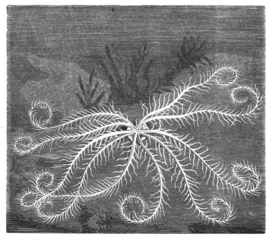 "When day declines, with the shades of night this fantastic garden is lighted up with renewed splendour. Millions of microscopic medusæ and crustaceans, like so many glowing sparks, dance through the gloom. The Sea-pen waves in a greenish phosphorescent light. Whatever is beautiful or wondrous among fishes, Echinoderms, jelly-fishes and polypi and molluscs, is crowded into the warm and crystal waters of the Tropical ocean."