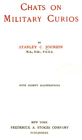 Project Gutenberg's Chats on Military Curios, by Stanley C. Johnson This eBook is for the use of anyone anywhere at no cost and with almost no restrictions whatsoever. You may copy it, give it away or re-use it under the terms of the Project Gutenberg License included with this eBook or online at www.gutenberg.org/license Title: Chats on Military Curios Author: Stanley C. Johnson Release Date: February 26, 2015 [EBook #48366] Language: English Character set encoding: ISO-8859-1 *** START OF THIS PROJECT GUTENBERG EBOOK CHATS ON MILITARY CURIOS *** Produced by Chris Curnow, Karin Spence and the Online Distributed Proofreading Team at http://www.pgdp.net (This file was produced from images generously made available by The Internet Archive)