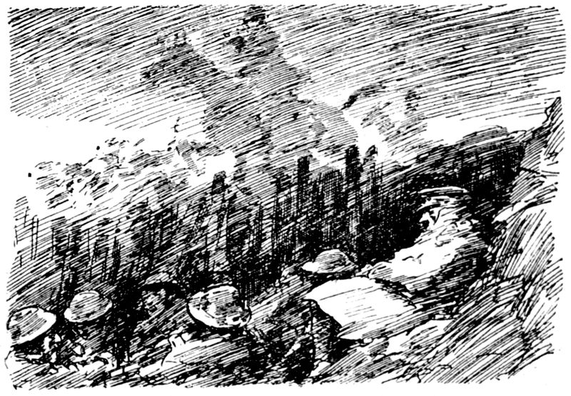 Ah! Bad luck! That one was well timed which burst over there on the right, just above the company that was lying down there. The damage must have been serious. Men lie on the ground who will never pick themselves up again. A cloud, the colour of absinthe, hangs sullenly over those little khaki spots.