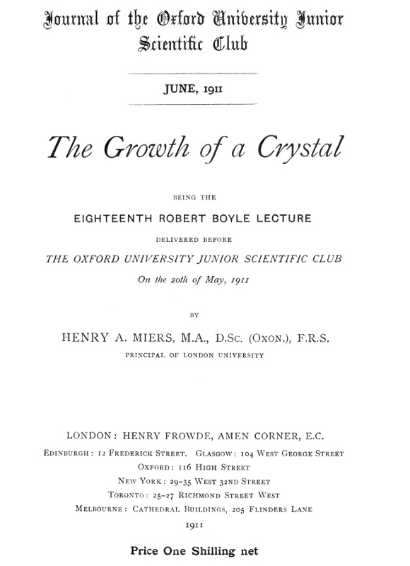 Three years before I came back to Oxford—on May 16th, 1893, the subject of crystal structure had been treated in the second Boyle Lecture in a most original and masterly manner by no less a person than Lord Kelvin. I well remember that Lecture, at which I had the good fortune to be present; and to one who was already interested in crystals it was a wonderfully illuminating and inspiring address.