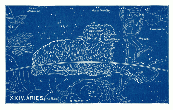 [pg 016]Each of these twelve parts (consisting each of about 30 degrees) is distinguished, not by numbers or by letters, but by pictures and names, and this, as we have seen, from the very earliest times. They are preserved to the present day in our almanacs, and we are taught their order in the familiar rhymes:—