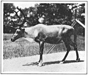 The elk sheds its antlers each year. The antlers of one of the largest males in the New York Zoological Park dropped on March twenty-first nine hours apart. On April 8th each budding antler looked like a big brown tomato. Ten days later the new antlers were about five inches long, thick and stumpy. By May 10th the elk was shedding its hair freely. On June 18th the antlers were at full length. By August 1st the short red summer coat of hair was established, and the antlers were still “in velvet,” The elk then began to rub the velvet from its antlers against the trees.