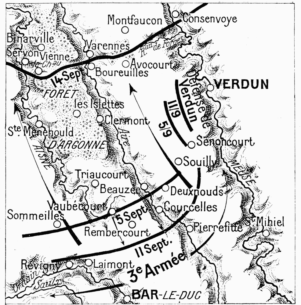 On September 5, under Joffre’s orders, the retreat came to an end, and the great battle, which was to save France, began. After six days of violent fighting (see Part III—The Revigny Pass—of the Battle of the Marne, 1914), the Crown Prince’s troops, under pressure of the French Third Army, retreated along both flanks of the Argonne; but during the latter half of September, they came to a stand, after reaching and consolidating the following positions: on the east, Montfaucon, commanding the ground between the Aire and the Meuse; Montblainville and Varennes, commanding the Valley of the Aire;{9} on the west, Binarville, Servon, and Vienne-le-Château, commanding the Valley of the Aisne. A fierce and prolonged battle then began. The French troops, held on the flanks, pushed on into the forest, in an endeavour to cut the enemy’s transverse lines of communication, which consisted of two main roads from east to west (see map, p. 8).