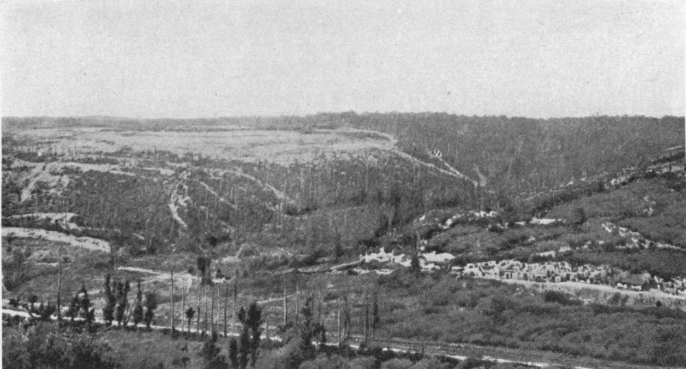 These picturesque spots have often charming names: Bois de la Viergette, Ruisseau des Emerlots, Fontaine la Houyette, Fontaine-aux-Charmes, Fontaine-Madame and Bagatelle. Sometimes the names are quaint: Fille-Morte, Moulin del’Homme Mort, Ferme-la-Mitte, Chêne Tondu and Courte-Chausse. Below the long ridge, which forms, as it were, the backbone of the forest, the Chemin de la Haute-Chevauchée, and, a little further west, the Pavillon St. Hubert evoke memories of bygone hunting-parties. All these names, yesterday but little known, are to-day famous, as for months they recurred almost daily in the Communiqués of the Great War, and each of them brings to mind, not one battle only, but a series of battles, fierce struggles, and hand-to-hand encounters in the dense undergrowth.