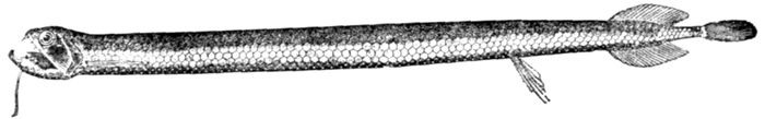 The Grenadiers: Macrouridæ.—The large family of grenadiers, or rat-tails, Macrouridæ, is confined entirely to the oceanic depths, especially of the north Atlantic and Pacific. The head is formed much as in the codfishes, with usually a barbel at the chin. There are two dorsals, the second like the anal being low, but the leptocercal tail is very long and tapering, ending in a filament 541without caudal fin. The scales are usually rough and spinous. The species are usually large in size, and dull gray or black in color.