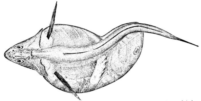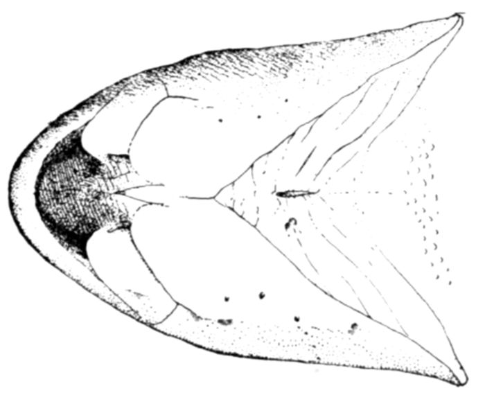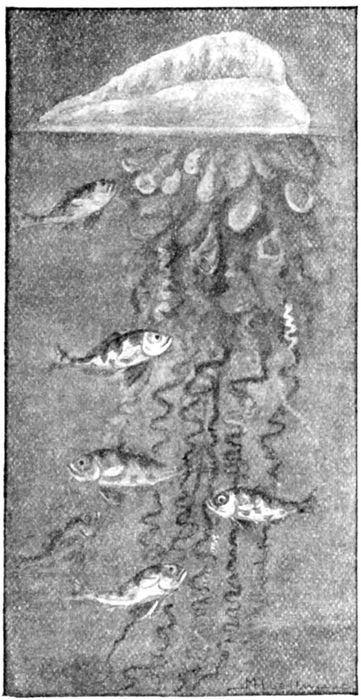 Aristotle gives, according to Professor Horace A. Hoffman, this account of the angler: "'Inasmuch as the flat, front part is not fleshy, nature has compensated for this by adding to the rear and the tail as much fleshy substance as has been subtracted from the front.' The βάτραχος is called the angler. He fishes with the hair-like filaments hung before his eyes. On the end of each filament is a little knob, just as if it had been placed there for a bait. He makes a disturbance in sandy or muddy places, hides himself and raises these filaments. When the little fish strikes at them he leads them down with the filaments until he brings them to his mouth. The βάτραχος is one of the σελάχη. All the σελάχη are viviparous or ovoviviparous except the βάτραχος. The other flat σελάχη have their gills uncovered and underneath them, but the βάτραχος has its gills on the side and covered with skinny opercula, not with horny opercula like the fish which are not σελαχώδη. Some fishes have the gall-bladder upon the liver, others have it upon the intestine, more or less remote from the liver and attached to it by a duct. Such are βάτραχος, ἔλλοψ, συνάγρίς, σμύραινα, and ξιφίας. The βάτραχος is the only one of the σελάχη which is oviparous. This is on account of the nature of its body, for it has a head many times as large as the rest of its body, and spiny and very rough. For this same 547reason it does not afterwards admit its young into itself. The size and roughness of the head prevent them both from coming out (i.e., being born alive) and from going in (being taken into the mouth of the parent). The βάτραχος is the most prolific of the σελάχη, but it is scarce because the eggs are easily destroyed, for it lays them in a bunch near the shore."