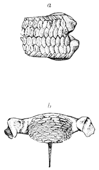 It was, in the first place, observed by Mr. Kent "that the fish while quietly reclining upon the bottom of its tank presented a most astonishing resemblance to a piece of inert rock, the rugose prominences in the neighborhood of the head lending additional strength to this likeness. This resemblance being recognized, it was next found, on a little closer inspection, that the fish constituted, in connection with its color, ornamentations, and manifold organs and appendages, the most perfect facsimile of a submerged rock, with that natural clothing of sedentary animal and vegetable growths common to boulders lying beneath the water in what is known as the laminarian zone. In this manner the numerous simple or lobulated membranous structures dependent from the lower jaw and developed as a fringe along the lateral line of the body imitate with great fidelity the little flat calcareous sponges (Grantia), small compound ascidians, and other low organized zoophytic growths that hang in profusion from favorably situated submarine stones. That famous structure known as the angler's 'rod and bait' finds its precise counterpart in the early growing phase of certain sea-plants, such as the oarweed (Laminaria), while the more posterior dorsal fin-rays, having short lateral branchlets, counterfeit in a like manner the plant-like hydroid zoophytes known as Sertulariæ. One of the most extraordinary mimetic adaptations was, however, found in connection with the eyes, structures which, however perfectly the surrounding details may be concealed, serve, as a rule, to betray the animal's presence to a close observer. In the case of the angler, the eyes during life are raised on conical elevations the sides of which are separated by darker longitudinal stripes into symmetrical regions, the structure, as a whole, with its truncated summit upon which the pupil opens, reproducing with the most wonderful minuteness the multivalve shell of a rook barnacle (Balanus). To complete the simile the entire exposed surface of the body of the fish is mapped out by darker punctated lines into irregular polygonal areas, whose pattern is at once recognized by the student of marine zoology as corresponding with that of the 545flat, cushion-like expansions of the compound tunicate Botryllus violaceus. Thus disguised at every point, the angler has merely to lie prone, as is its wont, among the stones and débris at the bottom of the sea and to wait for the advent of its unsuspecting prey, which, approaching to browse from what it takes to be a flat rock—differing in no respect from that off which it obtained the last appetizing morsel of weed or worm—finds itself suddenly engulfed beyond recall within the merciless jaws of this marine impostor."