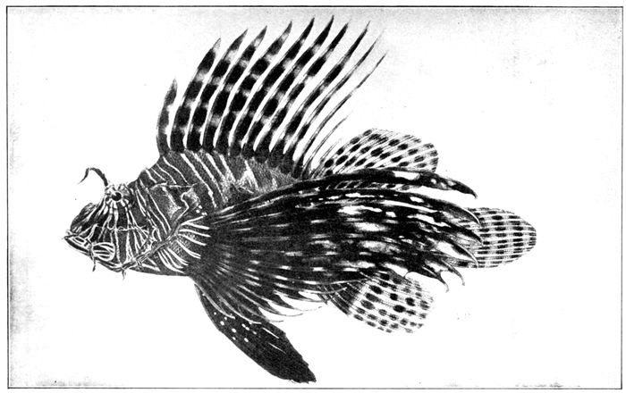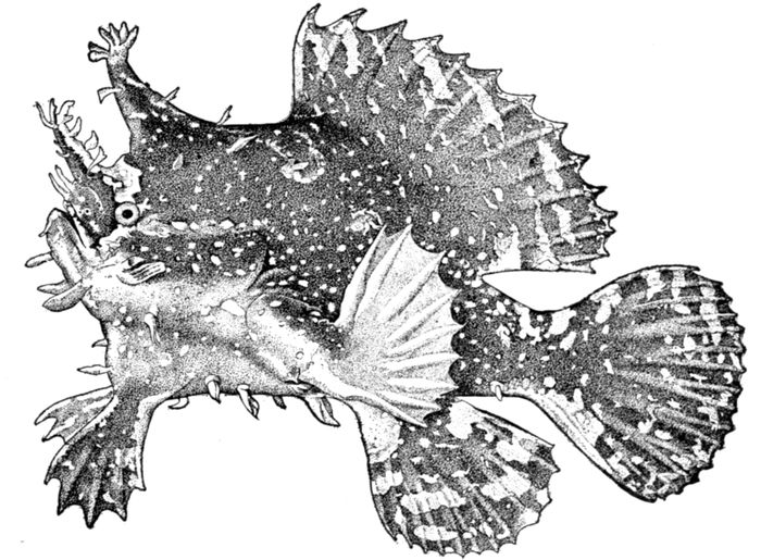 "The name 'angler' is derived from the supposition that by means of the foremost dorsal spine, which bears leaf-like tags, or appendages, at the end, it angles for fishes itself, lying upon the ground with its head somewhat upraised. According to Mr. S. Kent, however, this is at most only partly the case: 'That the fish deliberately uses this structure as a fisherman does his rod and line for the alluring and capture of other fish is a matter of tradition handed down to us from the time of Pliny and Aristotle, and which scarcely any authority since their time has ventured to gainsay. Nevertheless, like many of the delightful natural-history romances bequeathed to us by the ancient philosophers, this one of the angler-fish will have to be relegated to the limbo of disproved fiction. The plain and certain ground of facts, all the same, has frequently more startling revelations in store for us than the most fervid imaginations of philosophers, and that this assertion holds good in the case now under consideration must undoubtedly be admitted. It is here proposed to show, in fact, that the angler is one of the most interesting examples upon which Nature has exercised her handicraft, in the direction of concealing the identity of her protégé, such ingenuity being sometimes utilized with the object of protecting the organism from the attacks of other animals, or, as illustrated in the present instance, for the purpose of enabling it by stealth to obtain prey which it lacks the agility to hunt down after the manner of ordinary carnivorous fishes. To recognize the several details here described, it will not suffice to refer to examples simply, and usually most atrociously stuffed, nor even to those preserved in spirit, in which all the life colors are more or less completely obliterated and the various membranous appendages shrunk up and distorted. In place of this, a healthy, living example fresh from the sea, or, better still, acclimatized in the tanks of an aquarium, must be 544attentively examined, and whereupon it will be found that this singular fish, throughout the whole extent of its superficies, may be appropriately designated a living sham."