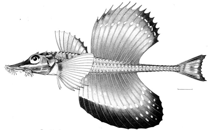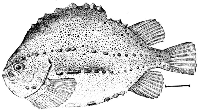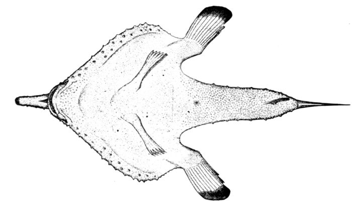 The common sea-bat, or diablo, of the West Indies, Ogcocephalus vespertilio, is dusky in color with the belly coppery red. It reaches the length of a foot. The angling spine is very short, hidden under the long stiff process of the snout. Farther north occurs the short-nosed batfish, Ogcocephalus radiatus, very similar, but with the nostril process, or snout, blunt and short. Zalieutes elater, with a large black eye-like spot on each side of the back, is found on the west coast of Mexico. In deeper water are species of Halieutichthys in the West Indies and of Halieutæa in Japan. Dibranchus atlanticus has the gills reduced to two pairs. Malthopsis consists of small species, with the rostrum prominent, like a bishop's miter. Two species are found in the Pacific, Malthopsis mitrata in Hawaii and Malthopsis tiarella in Japan.