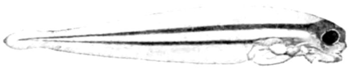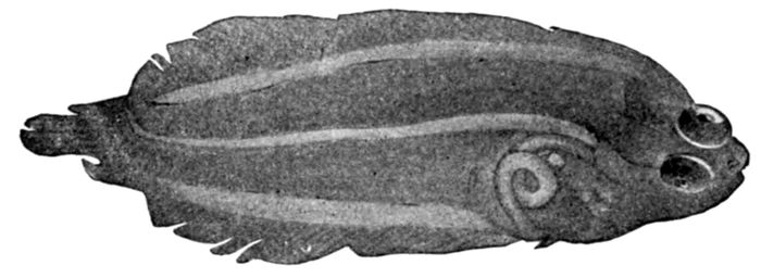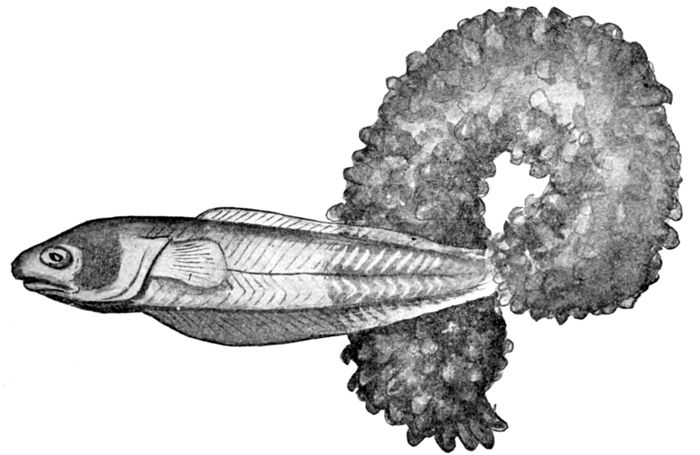 546"The angler, or goosefish, spawns in summer along the eastern Atlantic coast, and the result of its labor is quite remarkable. 'The eggs are very numerous, inclosed in a ribbon-shaped gelatinous mass, about a foot in width and thirty or forty feet long, which floats near the surface. One of these ribbons will weigh perhaps forty pounds, and is usually partially folded together and visible a foot or eighteen inches from the top of the water, its color being brownish purple. The number of eggs in one of these has been estimated to be from forty to fifty thousand.' The growth of the young after exclusion from the egg is rather rapid, and Professor Goode saw 'young fish two or three inches long' while others were yet spawning, and these young fish were presumably the fry of those that had spawned the same year, only somewhat earlier. In a few days after hatching they present a striking appearance on account of the enormous development of the pectoral and ventral fins."