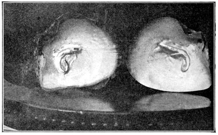 "The codfish in its mode of reproduction exhibits some interesting peculiarities. It does not come on the coast to spawn, as was once supposed, but its eggs are deposited in mid-sea and float to the surface, although it does really, in many cases, approach the land to do so. Prof. C. O. Sars, who has discovered its peculiarities, 'found cod at a distance of twenty to thirty Norwegian miles from the shore and at a depth of from one hundred to one hundred and fifty fathoms.' The eggs thus confided to the mercy of the waves are very numerous; as many as 9,100,000 have been calculated in a seventy-five-pound fish. 'When the eggs are first seen in the fish they are so small as to be hardly distinguishable; but they continue to increase in size until maturity, and after impregnation have a diameter depending upon the size of the parent, varying from one-nineteenth to one-seventeenth of an inch. A five- to eight-pound fish has eggs of the smaller size, while a twenty-five-pound one has them between an eighteenth and a seventeenth.' There are about 190,000 eggs of the smaller size to a pound avoirdupois. They are matured and ejected from September to November."