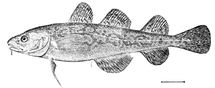 536The Alaska cod, Gadus macrocephalus, is equally abundant with the Atlantic species, from which it differs very slightly, the air-bladder or sounds being smaller, according to the fishermen, and the head being somewhat larger. This species is found from Cape Flattery to Hakodate in Japan, and is very abundant about the Aleutian Islands and especially in the Okhotsk Sea. With equal markets it would be as important commercially as the Atlantic cod. In the codfish (Gadus) and related genera there are three dorsal and two anal fins. In the codfish the lateral line is pale and the lower jaw shorter than the upper.
