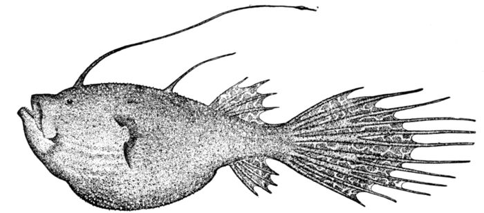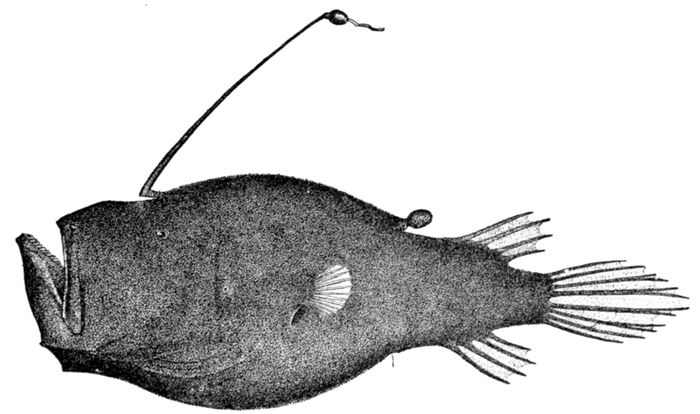 "The bathybial sea-devils are degraded forms of Lophius; they descend to the greatest depths of the ocean. Their bones are of an extremely light and thin texture, and frequently other parts of their organization, their integuments, muscles, and intestines are equally loose in texture when the specimens are brought to the surface. In their habits they probably do not differ in any degree from their surface representative, Lophius. The number of the dorsal spines is always reduced, and at the end of the series of these species only one spine remains, with a simple, very small lamella at the extremity (Melanocetus johnsonii, Melanocetus murrayi). In other forms sometimes a second cephalic spine, sometimes a spine on the back of the trunk, is preserved. The first cephalic spine always retains the original function of a lure for other marine creatures, but to render it more effective a special luminous organ is sometimes 549developed in connection with the filaments with which its extremity is provided (Ceratias bispinosus, Oneirodes eschrichtii). So far as known at present these complicated tentacles attain to the highest degree of development in Himantolophus and Ægæonichthys. In other species very peculiar dermal appendages are developed, either accompanying the spine on the back or replacing it. They may be paired or form a group of three, are pear-shaped, covered with common skin, and perforated at the top, a delicate tentacle sometimes issuing from the foramen."
