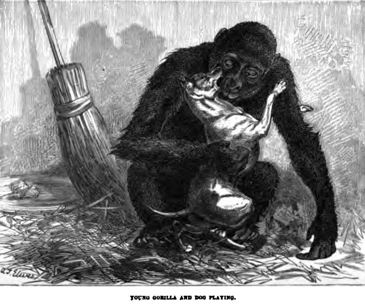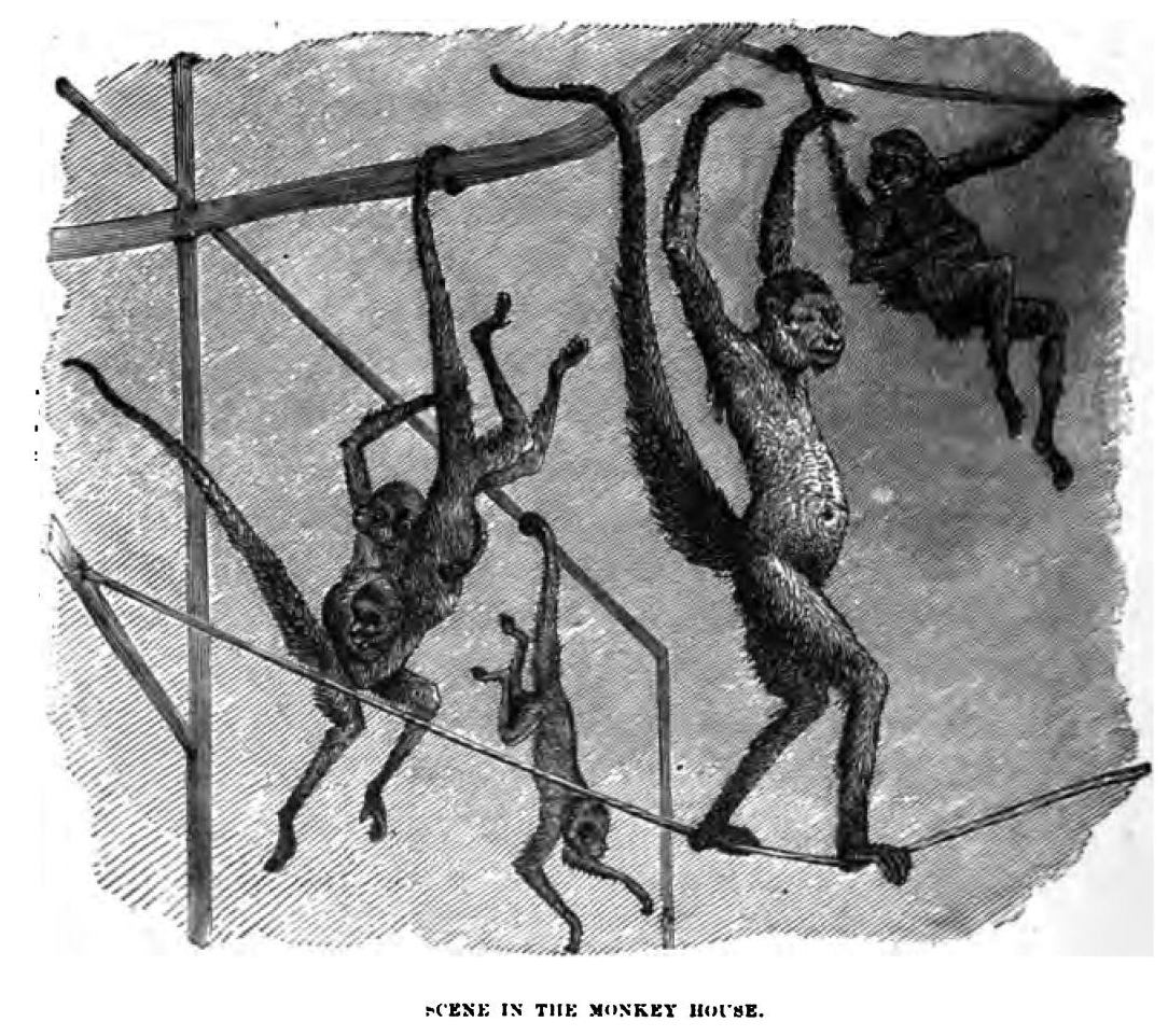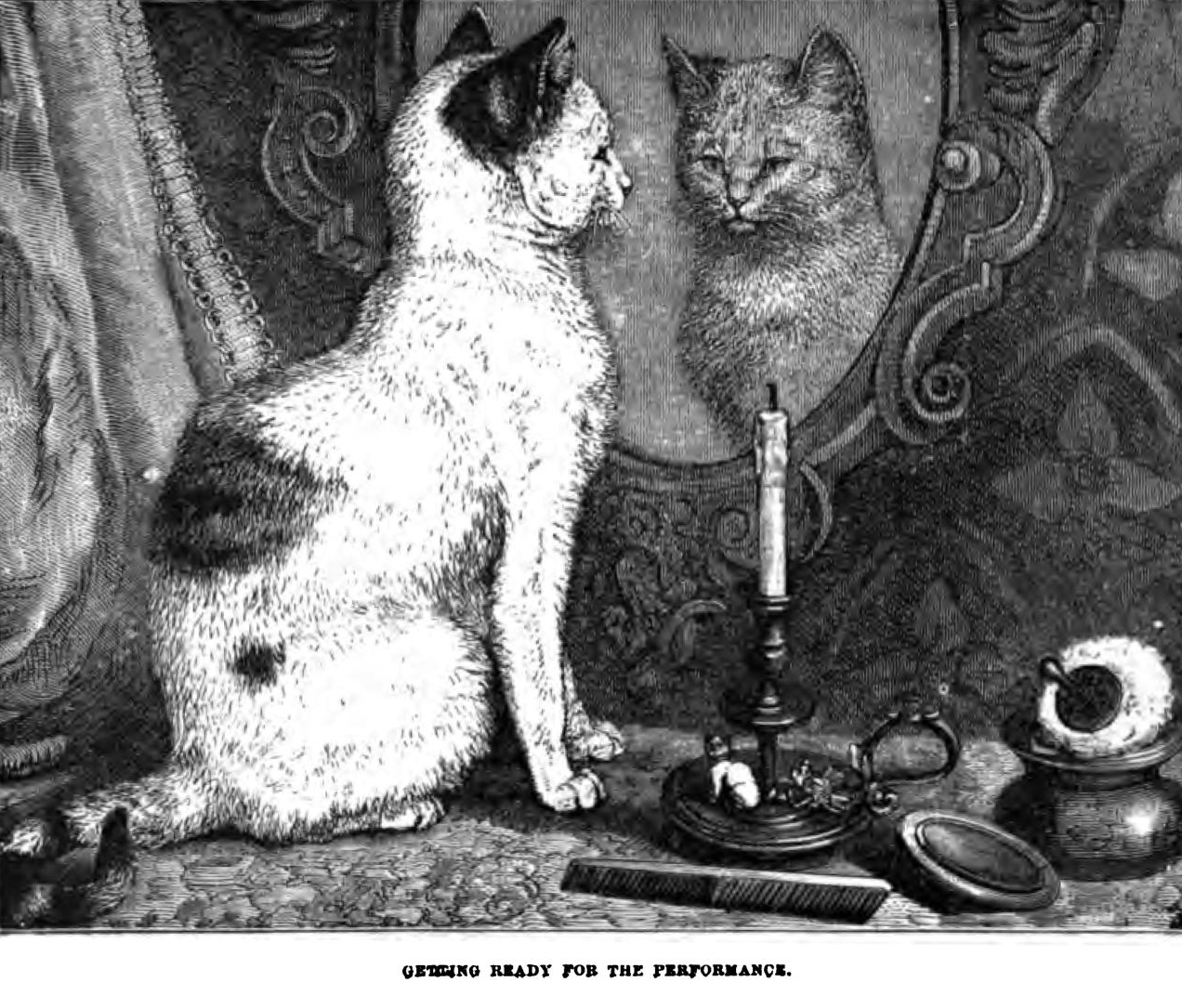 “'Yesterday was a good day for the monkeys at the Fair grounds, and they liked it. They frisked about in the sunshine, and cut their antics with an abandon that showed them to be bubbling over with fun and mischief. There is one that by some amusing peculiarities becomes an immediate favorite with every spectator. A gentleman in the crowd yesterday happened to have a small pocket-mirror, and just for sport passed it to the favorite. The monkey's behavior, on seeing his face reflected in the glass, kept the crowd in a roar of laughter for nearly an hour. The monkey of course failed to recognize the reflection of himself, and took it for another monkey, and his anxiety to get hold of that monkey was what made the fun. He would look behind the glass, and feel for it in such a comical way while he was looking in the glass, that one could not help laughing. While the glass was close to his eye he gradually bent over, casually, and noticing that the evanescent monkey was on his back apparently he dropped the glass and made a sudden grab for him. When he didn't get him he looked surprised and commenced looking under the straw to see what had become of him. He was then seized with a luminous idea. He picked up the glass and ran to the topmost branch of the dead tree that is erected in the cage, and climbing to the extreme end, again looked in the glass. It seemed he reasoned that in such a position the monkey could not get away. He felt for it, grabbed at it, and tried all sorts of strategy to capture it, notwithstanding repeated failures.'”