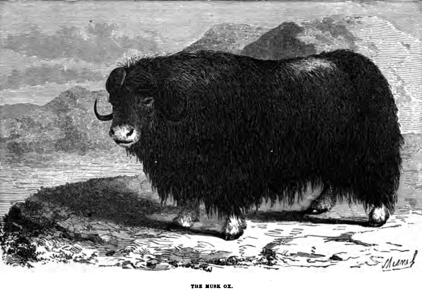 “Yes,” said Mr. Graham, “he is a relative of the yak, though somewhat smaller, in fact he is so small that he resembles a large sheep more than an ox. He belongs in the cold regions of North America, and is very useful to Arctic explorers, who feed upon his flesh. He has a covering of thick and long hair of a dark brown color, and his horns are thick and large, bending downwards over the sides of his head and then suddenly backwards and upwards at the tips.”
