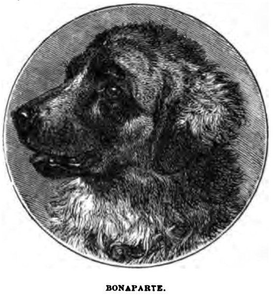 He rejoiced in the ambitious name of Bonaparte, being familiarly called 'Boney,' which latter name described him very nearly, for he was a monster, standing over thirty inches high at the shoulder. In markings and make-up he is said to have closely resembled Landseer's 'Distinguished Member of the Humane Society.' He was remarkable for his intelligence as well as his unvarying good temper and was a prime favorite with young and old in the then little city, especially among children, toward whom he, in common with most members of his race, exhibited great affection and devotion.