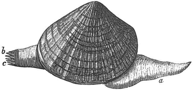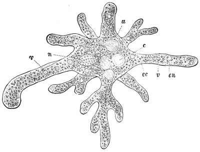 Fig. 1.—Amœba proteus, with the pseudopodia (false feet) protruded, enlarged 200 diameters (after Leidy): n, nucleus; c, contractile vesicle; v, one of the larger food-vacuoles; en, the granular endosarc; ec, the transparent ectosarc; a, cell of an Alga taken in as food (other cells of the same Alga are obliquely shaded).]